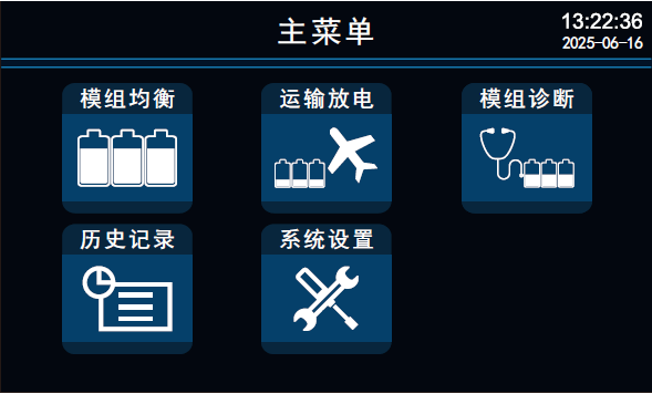 主菜单 主菜单包含模组均衡、运输放电、模组诊断、历史记录和系统设置功能。 Updated on 1 7 月, 2025 Related Articles 历史记录/系统设置 模组诊断 模组均衡/运输放电